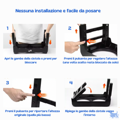 La nostra Ciotola Doppia Rialzata è progettata per migliorare la postura del tuo pet mentre mangia, riducendo la tensione su collo e articolazioni.